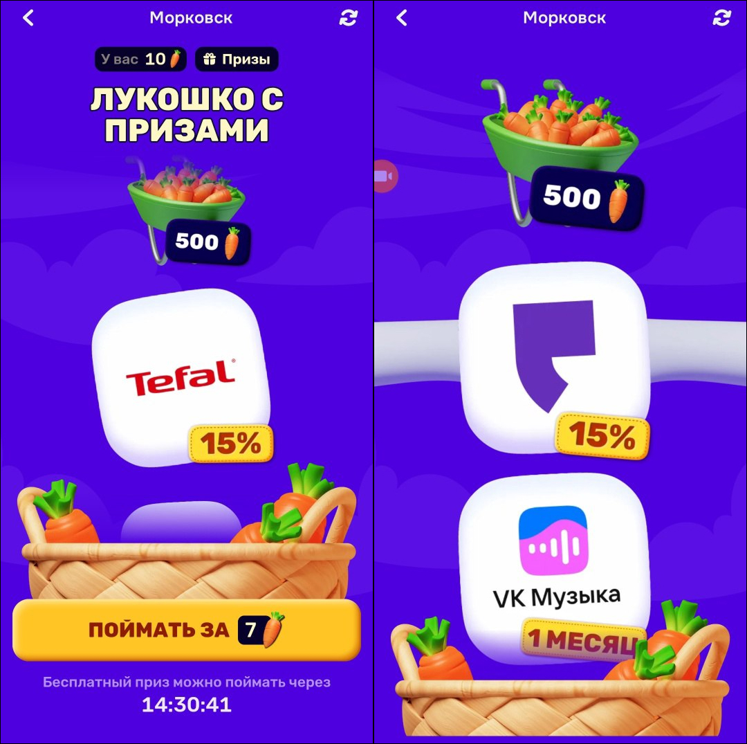 Озон "Морковск" нельзя назвать каким-то очень оригинальным примером геймификации, но, на мой взгляд, он достаточно хорошо сбалансирован. Есть игровая валюта — морковки, которые пользователи получают за всю полезную деятельность (за покупки, регулярные заходы, выполнение заданий, прохождение мини-игры и кручение колеса). Вариантов получения достаточно много, и можно сказать, что они разбиты по степени вовлеченности пользователя: кто-то максимум готов запустить приложение, кто-то готов поиграть в мини-игру или крутануть колесо и испытать удачу, а кто-то готов и что-то потратить — ну или, может быть, он и так собирался делать покупки, а морковки получаются как приятный бесплатный бонус.