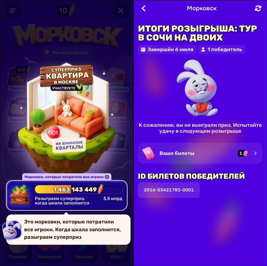 Дальше эти морковки открывают доступ к розыгрышам. При этом пользователю буквально нужно покупать доступ к розыгрышу, и таких розыгрышей очень много. Обычно розыгрыши проводятся фоново или есть какой-то один глобальный розыгрыш, но здесь механику вывели на новый уровень — действительно можно выбирать, на что потратить свои морковки. В зависимости от выбора участника акции, нужна ли ему кофеварка или PlayStation. Также довольно редкий вариант — это розыгрыши, которые активируются при накоплении шкалы морковок, то есть по сумме общей активности всех пользователей. И по целевым цифрам (3,5–4,5 миллиарда морковок) видно, насколько массовая данная акция, насколько много пользователей в ней участвуют, зарабатывают и тратят морковки. Интересно, что шкала заполняется именно при трате морковок, а не просто при их заработке.