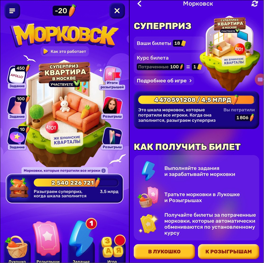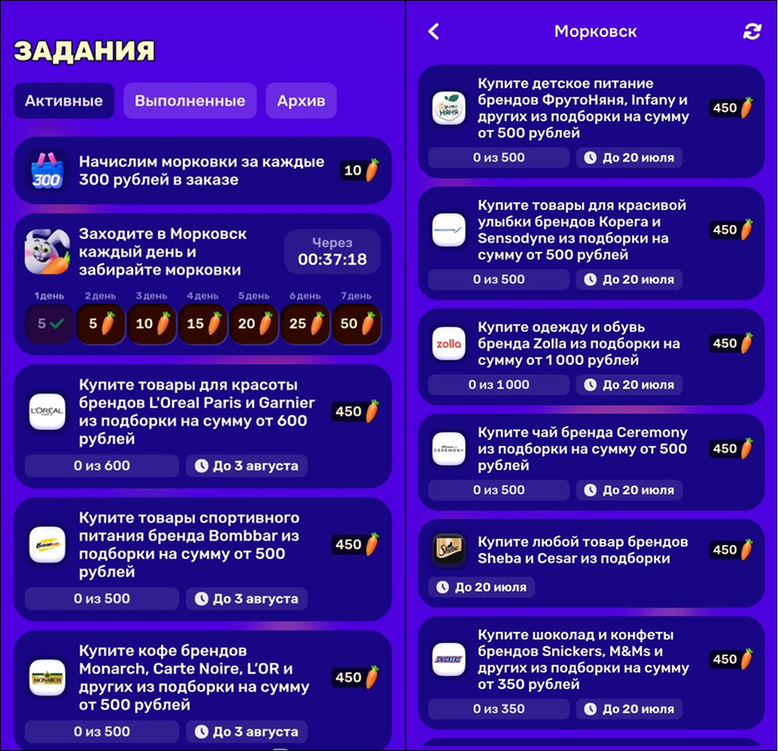 Выполнение заданий позволяет накопить достаточное количество морковок для участия в дальнейших активностях акции (розыгрышах и мини-играх).