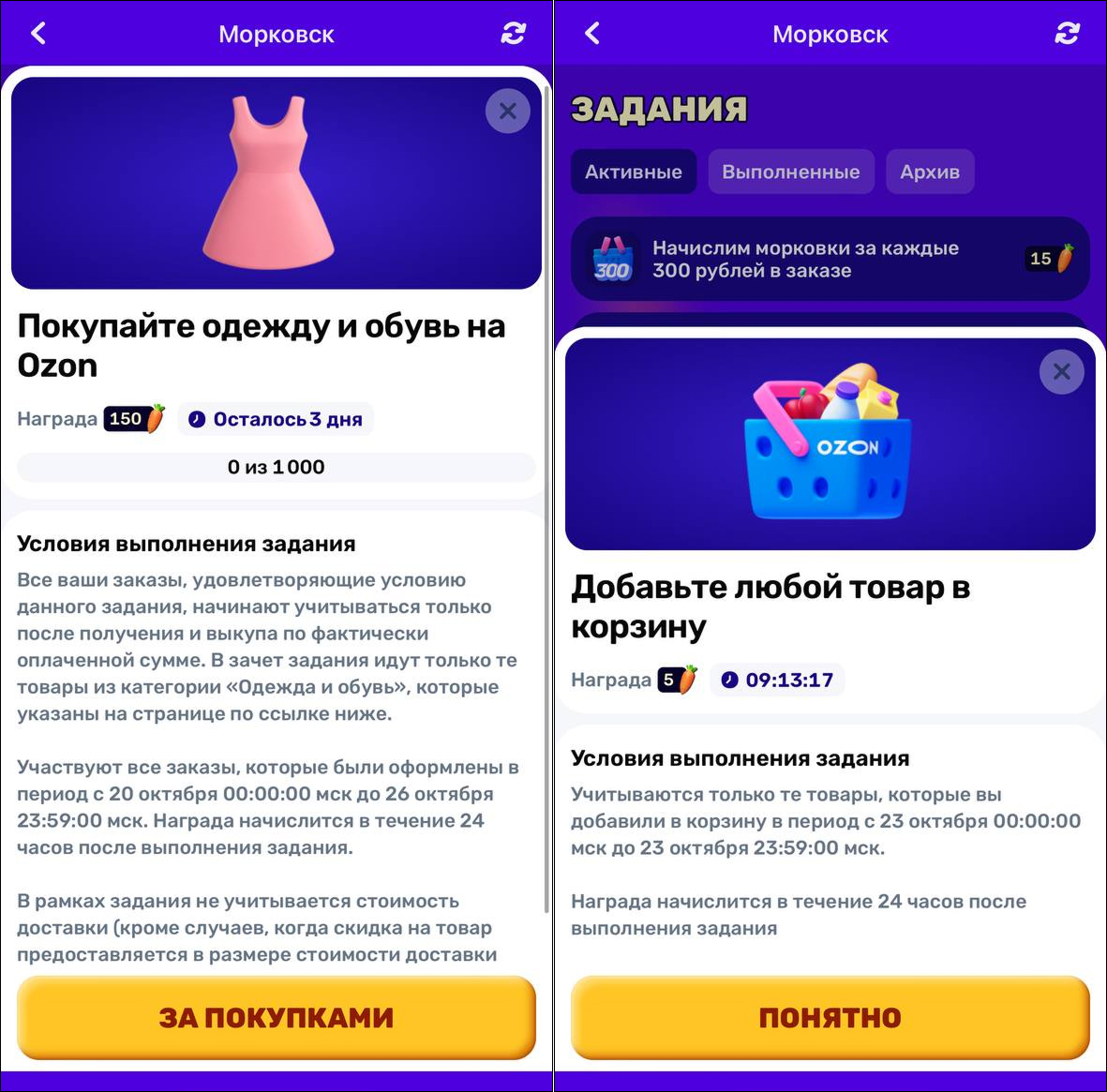 В Морковске единая виртуальная валюта — морковки, которые начисляются за выполнение заданий внутри приложения Ozon, совершение покупок, участие в игровых активностях, а также за покупки у специальных бренд-партнёров. Начисление морковок происходит после фактического получения заказа.