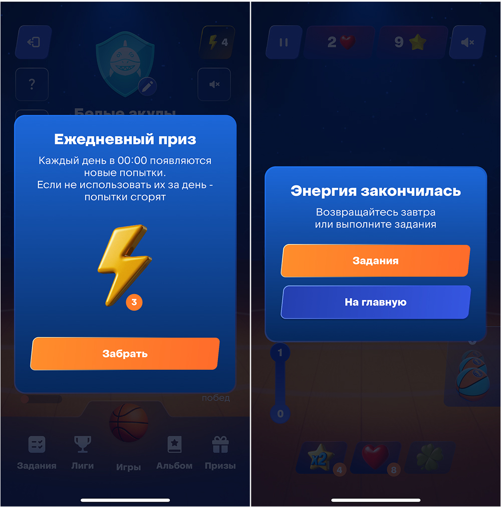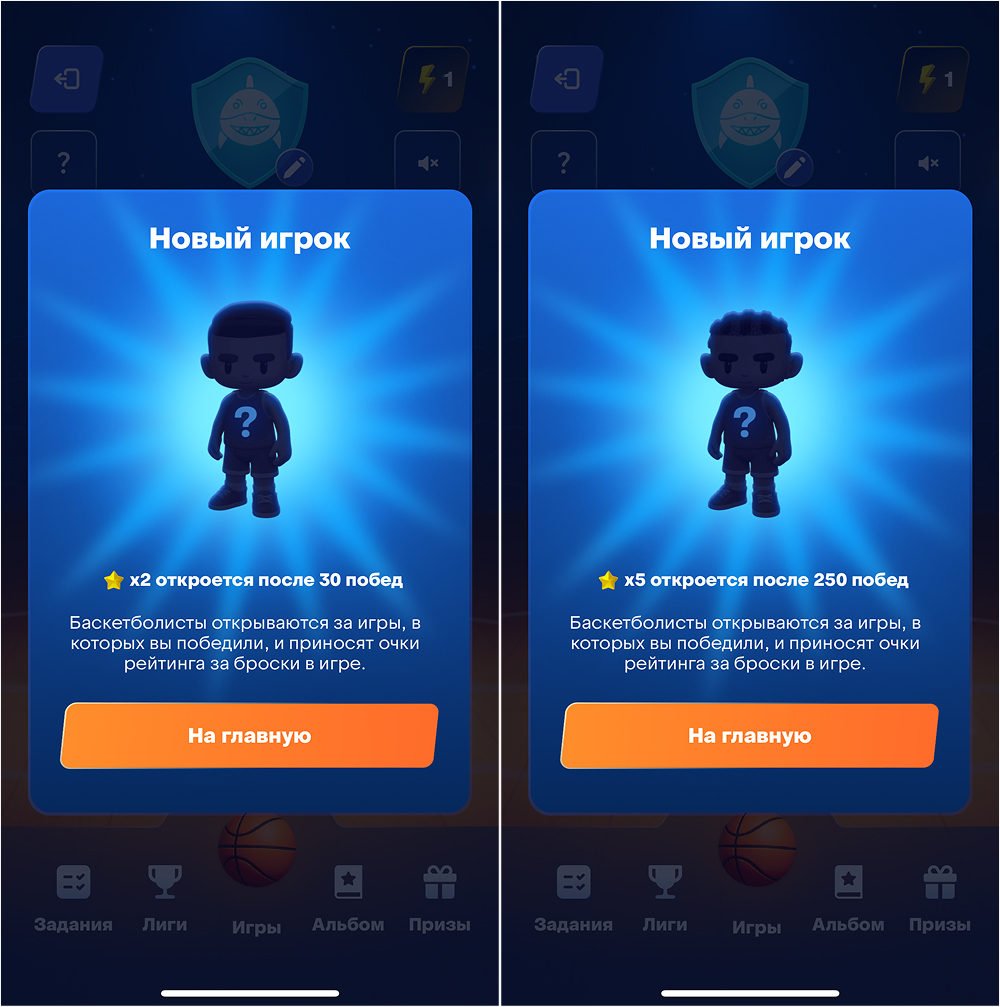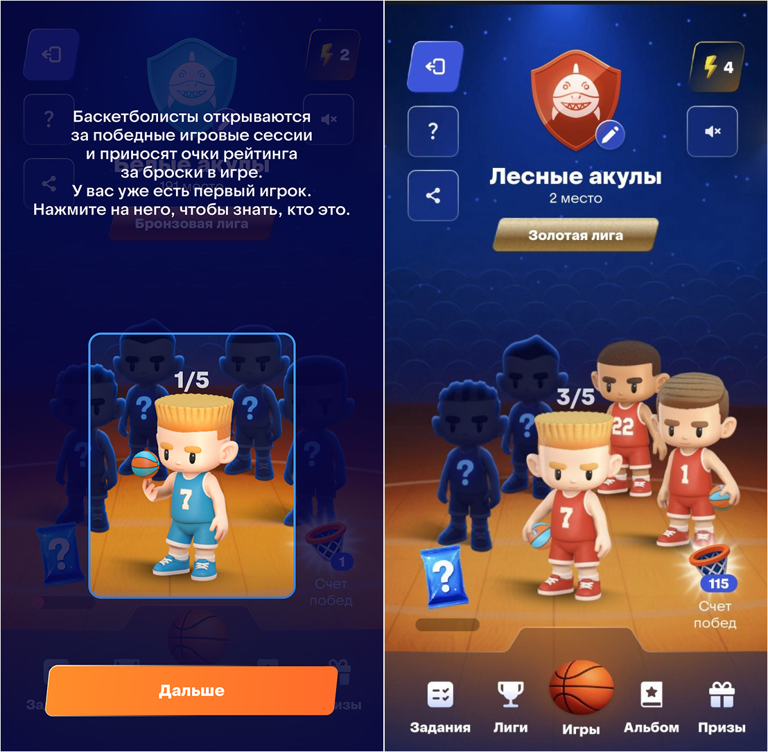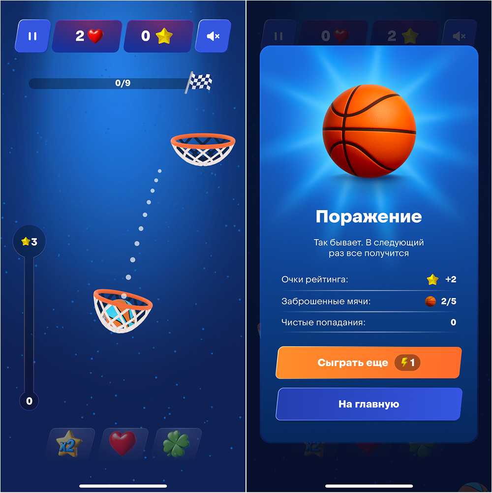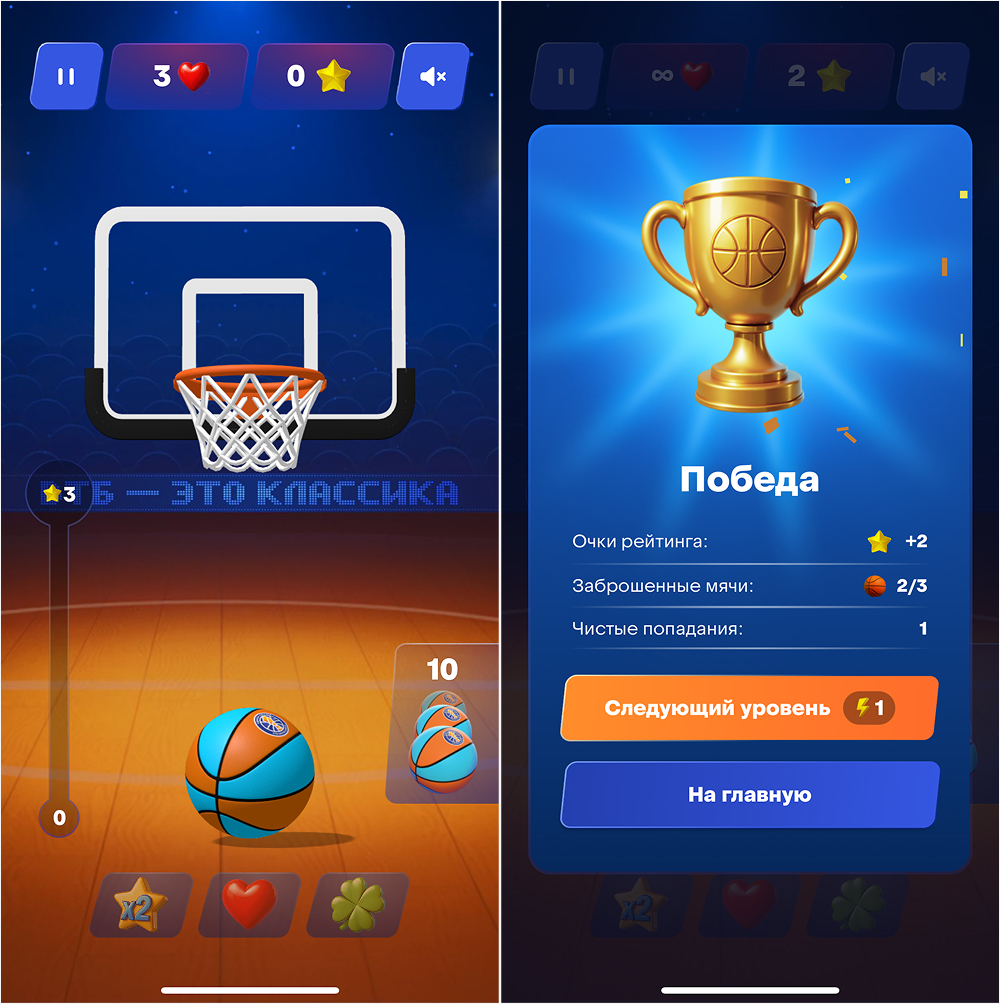 В разделе «Игры» доступны две мини‑игры, они нужны для заработка звезд, чтобы продвигаться по рейтинговой таблице. Чем больше звезд, тем выше позиция в рейтинге. Звезды копятся за каждый успешный бросок в мини-играх (см.ниже)