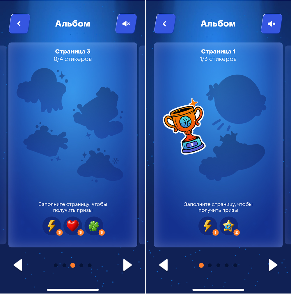 Когда страница альбома полностью заполнена, игрок получает подарки это могут быть дополнительные бустеры, попытки, звёзды или гарантированный приз (цифровой сертификат, промокод, бонусы партнёров).