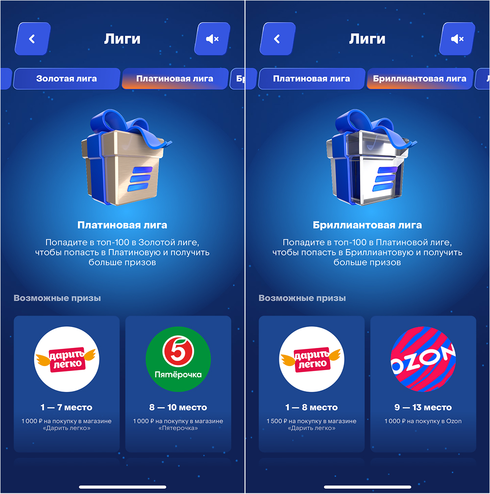 Призы распределяются по итогам периодов: чем выше лига и место, тем дороже подарки — от промокодов и мерча до билетов на матчи, гаджетов и крупных сертификатов.